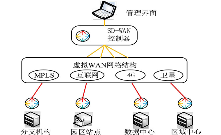 在 SD-WAN 控制器之上还有一个管理界面,它属于业务层的,是 SD-WAN 控制层的可视化界面。在可视化界面上可以知道网络转发层的底层状态,也可以根据业务需求选择 MPLS 专线、普通 Internet 线路等一系列操作,实现 SD-WAN 的业务按需部署思想。在 SD-WAN 架构的底层,连接着远程分支机构、园区站点、数据中心等,真正实现分支与总部的实时信息交互,控制器统领全局的效果。